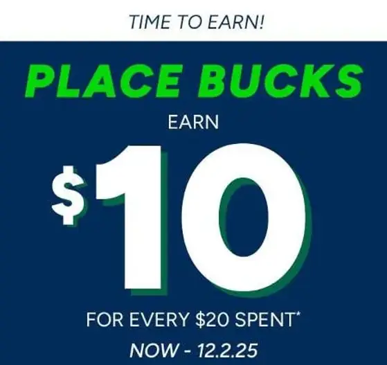 Time to earn! Shop in store and earn $10 PLACE Bucks for every $20 spent.