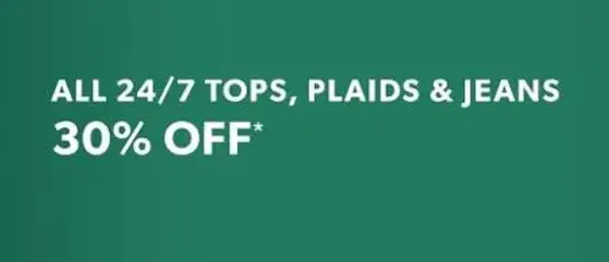 Get it now! Shop in store and get 30% off all 24/7 tops, plaids & jeans.