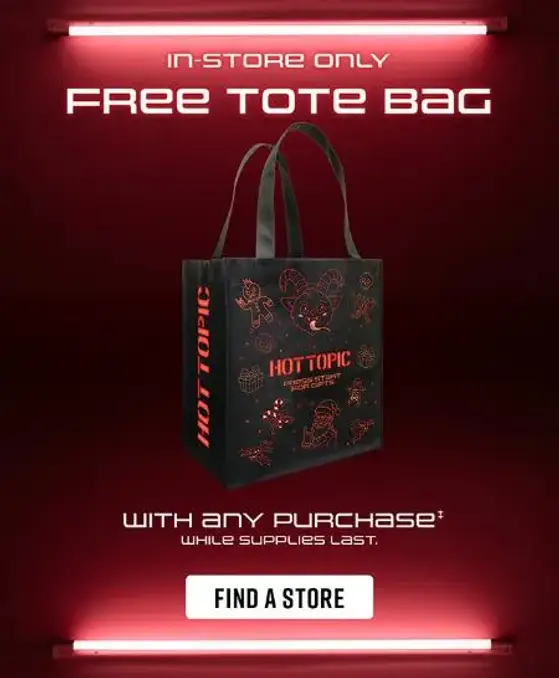 Receive a free Krampus tote bag (the “Gift”) with the purchase of any item in Hot Topic stores on November 28, 2025. Offer valid in-store only while supplies last. Limit one (1) Gift per transaction. Supplies are limited. Offer has no cash value, and Gift may not be exchanged or redeemed for cash. Exclusions apply, see associate for details.