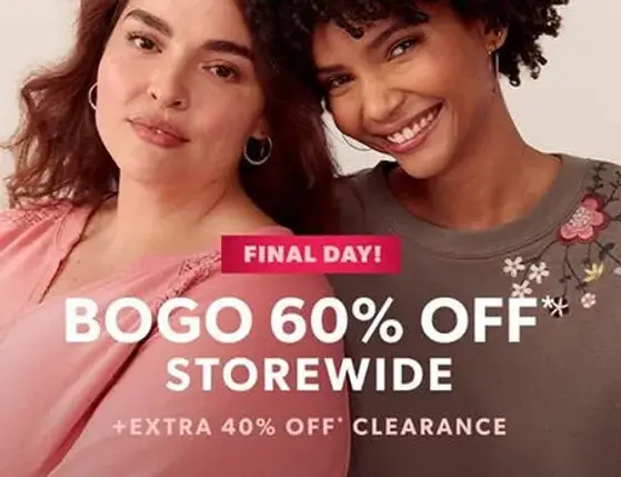 Final day! Shop in store and enjoy buy one, get one 50% off everything + extra 40% off clearance.